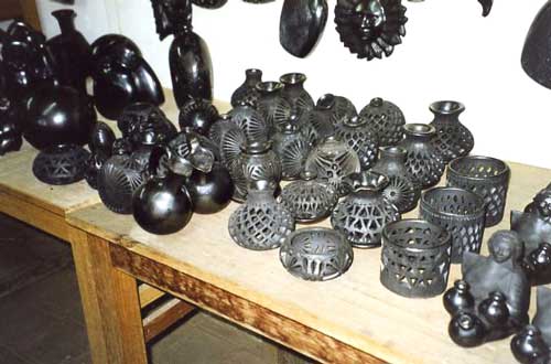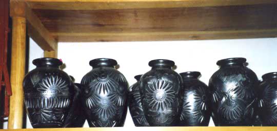 Located only 8 miles from Oaxaca City, the small town of San Bartolo Coyotepec is famous for its unique black pottery. Lovers of arts and crafts come to peruse a wide variety of highly burnished pieces, decorated with textured floral motifs. Although the pots were once made to carry mescal on the backs of burros from hillside farms to the surrounding towns, the introduction of lighter plastic jugs in the 1950s made them obsolete. A new technique developed by Doña Rosa changed the character of the pots from the simple red-gray color to the brilliant black surface with artful designs that today so many visitors find attractive.