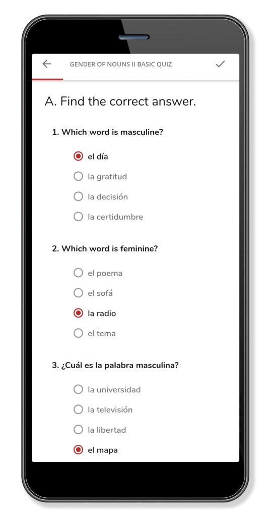 You may know that we already offer test and quizzes on StudySpanish.com. This update not only adds those to the Camino app, it also synchronizes your answers and results between the two.