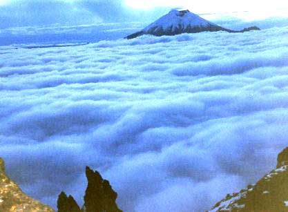 Mientras subíamos laboriosamente en la oscuridad, la luz de nuestras linternas revelaba formaciones de hielo cambiantes y fantásticas. Por fin, el primer resplandor de la mañana reveló cumbres distantes e indicios de valles lejanos. Al llegar a la cima al amanecer, nos alternábamos observando la caldera y escudriñando el panorama que se extendía ante nosotros. Al cabo de una hora debimos bajar, porque aún a esta altura el sol tropical pronto comenzaría a derretir la nieve y el hielo, creando condiciones peligrosas.