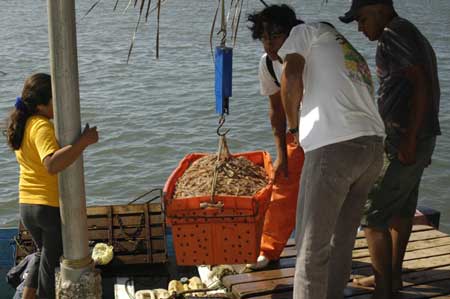 “¡Periódico, compre el periódico!” Un anciano montado en un viejo triciclo tirado por un burro con un muchacho encima da la vuelta a la esquina. Demasiado viejo para pedalear él mismo, el hombre ha alistado a su nieto para que lo lleve. Al calentarse el día, los primeros barcos regresan para descargar sus grandes cestas de camarón. Con suerte comeremos algunos de esos camarones en un restaurante esta noche. A poca distancia dos muchachos acarrean camarones, y los observo mientras los utilizan de carnada en un gancho triple al final de un cordel enredado en una vieja botella de refresco. Pronto sacan un pardo, un tipo de pescado blanco. Los muchachos pescan en serio. Esto es cuestión de alimentarse, no de divertirse.