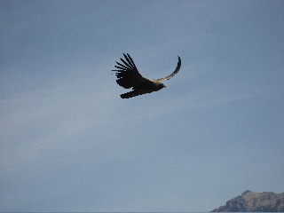 To make life even harder, condors have been persecuted by humankind for hundreds of years. Indigenous people have long hunted them because they believe the bone and organs have medicinal powers. Farmers kill them because the erroneously believe that condors kill their livestock. Deforestation and pollution have also decimated their numbers. Though they were added to the endangered species list in 1973, their numbers may still be declining in some parts of South America. Any comeback will be slow because these birds, which can live for 50 years, mate for life, and if the mate is killed, the survivor may not find another mate. Also, condors mate only every few years, and their chicks take 6-7 years to reach sexual maturity. Thus, replenishing their numbers is a slow process. One bright spot is that methods similar to those used to reintroduce the California condor into the wild are being tried in South America with some success. Also, many people are starting to realize that tourists come to see the condors, and if nothing else they have an economic incentive to protect them But this silent bird, which has no voice box, has been revered in South America since at least 2500 B.C. Intertwined with Andean mythology, the condor symbolizes power and health to the indigenous people of the highlands. It was worshiped as a ruler of the upper world, and was related to the sun god of their belief system. I do not believe the Andean people will let this magnificent bird disappear, for they are awakening to the truth that the condor is part of the fabric of their own story. If they let it disappear part of their own soul would die with it. As we watched the condors soar above us, we felt we needed them to remind us to lift ourselves to greater heights so that our spirits may travel further on this earth. Without them, we would be less human and the world would be a lonelier place.